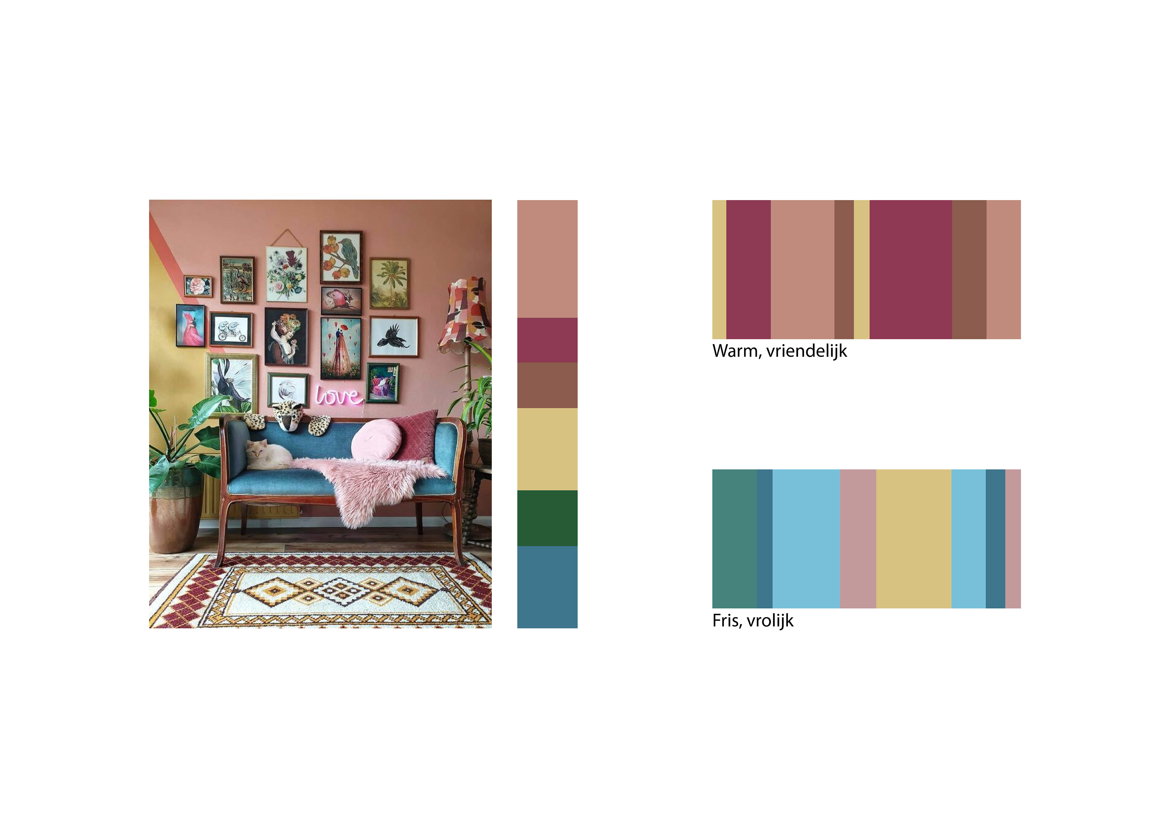 Voor dit interieur heb ik het kleurenpalet 'warm, vriendelijk' gebruikt. Dit zie je terug door de warme roze tinten en de pilaren die geel zijn gemaakt. De houten vloer maakt de ruimte ook al een stuk warmer.